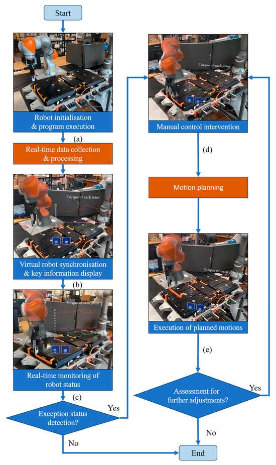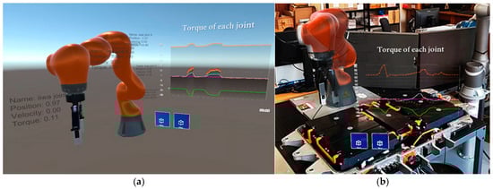 Initially, the robot was initialised by loading a predefined programme designed for busbar disassembly, as shown in Figure 7a. During operation, sensors continuously collected data on the robot’s performance. These data were then transmitted to a processing unit for analysis. Simultaneously, the DT system was updated in real time within the AR interface, which visually represented the processed data, as depicted in Figure 7b. This included real-time updates of the virtual robot’s pose in the AR environment to ensure synchronisation with the physical robot’s movements. Additionally, information about each joint and torque dataset was displayed in text and line graph formats, enabling operators to intuitively understand the current status.
