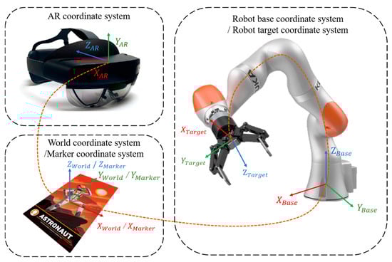 A coordinate system integration method has been implemented to ensure that operations in the virtual environment are precisely mapped to the actual actions of the industrial robot. This method facilitates seamless interaction between virtual and real entities by aligning the virtual space coordinate system within the AR environment with the robot’s actual spatial coordinate system. Upon system startup, the initial coordinate system of the AR is set based on the position of the HoloLens 2 and is precisely calibrated using a marker-based approach. There are five coordinate systems, as shown in Figure 5, which are the AR coordinate system , world coordinate system , marker coordinate system , robot base coordinate system , and robot target coordinate system .