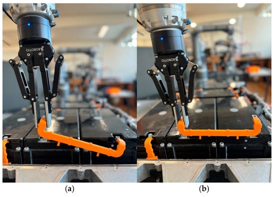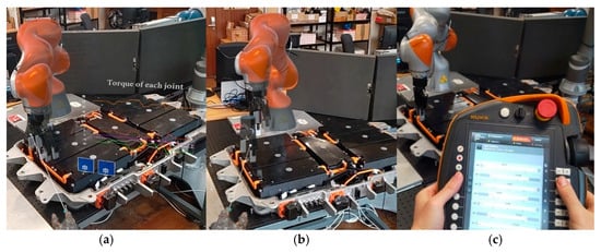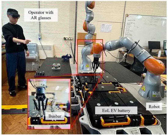 The proposed system was applied to remove the busbar from an EoL plug-in hybrid EV battery in a teleoperated robotic disassembly platform to demonstrate the feasibility of the system. As shown in Figure 6, the key equipment used in the experiment included the KUKA LBR IIWA 14 R820 robot (by KUKA Robotics, Augsburg, Germany), a Robotiq 2F-140 gripper (by Robotiq, Levis, QC, Canada), and Microsoft HoloLens 2 AR glasses (by Microsoft, Washington, DC, USA). The development of the AR environment was carried out on an external PC workstation equipped with an Intel Core i7-11800H CPU (by Intel Corporation, Santa Clara, CA, USA), 3.2 GHz, 32 GB RAM, and an Nvidia RTX 3070 8GB GPU (by Nvidia Corporation, Santa Clara, CA, USA) running Microsoft Windows 10. Furthermore, the system utilised Visual Studio 2019 as the integrated development environment (IDE), along with tools such as Unity LTS version 2020.3.42f1 and the Mixed Reality Toolkit. The ROS, which serves as the core communication framework, was deployed on an external PC running the Ubuntu 20.04 OS, which is responsible for data exchange and command transmission between the AR interface and the physical robot. Additionally, a wireless router with wired ethernet ports was used to connect and communicate between equipment.