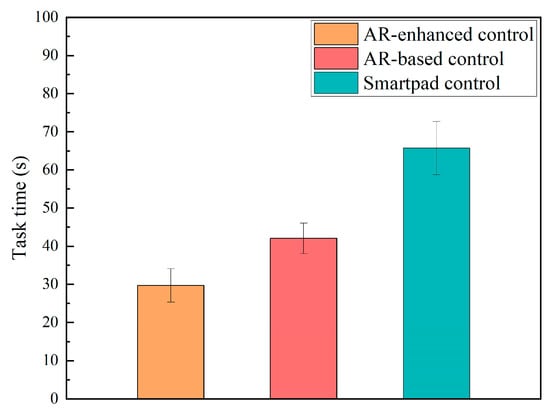 Within the scope of these methods, the proposed system exhibited an average task completion time of 29.7 s (SD = 4.38), the AR-based control method had an average of 42.05 s (SD = 3.99), and the smartpad control method lagged at an average of 65.75 s (SD = 6.96), as shown in Figure 10. These findings underscore the advantages of providing real-time operational information within an AR system for complex remote control tasks.