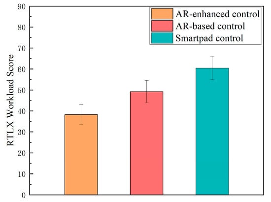 Specifically, as shown in Figure 11, the AR-enhanced control method achieved a significantly lower average NASA-TLX score of 38.24 (SD = 4.72) than the AR-based control (average score of 49.19, SD = 5.31) and smartpad control (average score of 60.44, SD = 5.48) methods. These findings suggest that integrating AR technology with real-time feedback significantly reduces the perceived workload in remote control tasks for industrial robots, thereby enhancing operational efficiency and reducing task complexity.