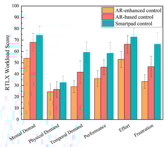 Subsequently, three key dimensions were focused upon, namely mental demand, effort, and frustration, based on the following considerations: first, mental demand is directly linked to the complexity of operations and cognitive burden, serving as a critical indicator of the psychological stress experienced by users employing different control methods. Second, effort reflects the energy and exertion required to complete tasks, representing an essential measure of task difficulty. Finally, frustration evaluates the emotional response of users when they encounter operational difficulties, directly affecting their satisfaction and the sustainability of their performance. By assessing these dimensions, a more detailed understanding was obtained of how different remote control methods impact user experience. As illustrated in Figure 12, the results revealed that participants using the AR-enhanced control method scored significantly lower in mental demand, with an average of 53.9 (SD = 7.17) compared to those using AR-based control at 68.05 (SD = 7.79) and smartpad control at 74.1 (SD = 8.14). This indicates a superior reduction in psychological burden by the AR-enhanced control method. Similarly, this method also exhibited lower average scores in effort, at 52.85 (SD = 7.04) compared to 66.25 (SD = 7.75) for AR-based control and 72.6 (SD = 7.69) for smartpad control, further confirming its benefits in reducing user effort. Additionally, the AR-enhanced control method scored more favourably in frustration, with an average of 33.4 (SD = 6.0) versus 46.65 (SD = 9.09) for AR-based control and 66.1 (SD = 10.47) for smartpad control. Lower frustration scores suggest fewer difficulties or more effective problem handling by users employing AR-enhanced control.