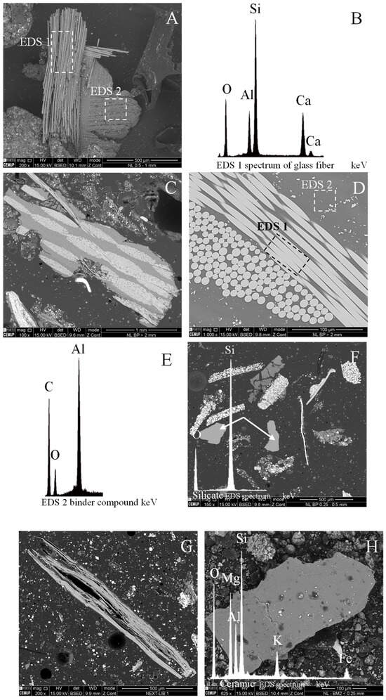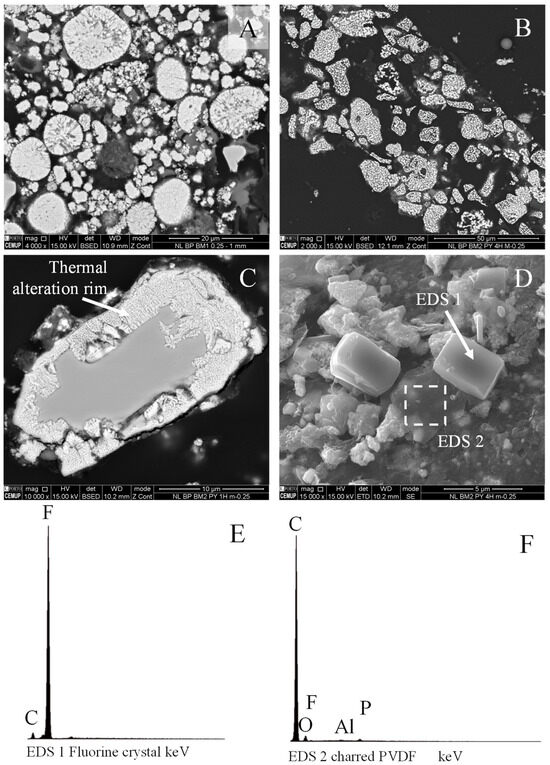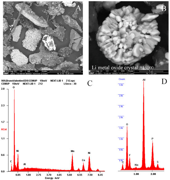 - Angular particles composed of twinned crystals and lamellae (Figure 12B,D), with colors varying between white, gray, dark gray, and pale blue, which are purple and pale purple under polarized and retarded light, were described as Li-Co-O after EDS analysis;