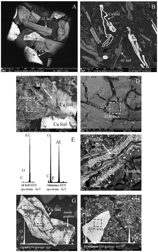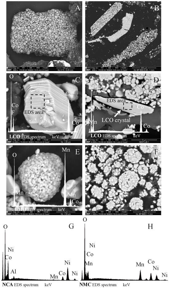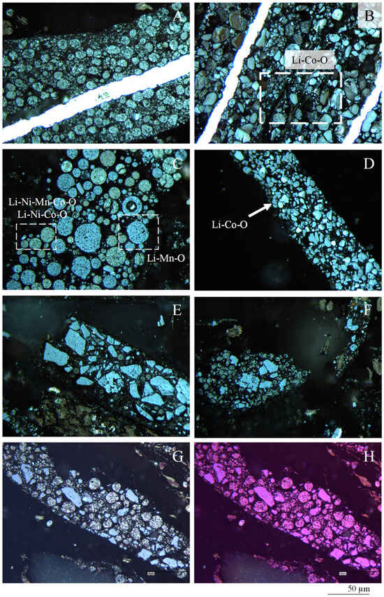 - White spherical particles (Figure 12C,H), which are dark purple under polarized and retarded light, were described as Li-Ni-Co-O and Li-Ni-Mn-Co-O after EDS analysis;