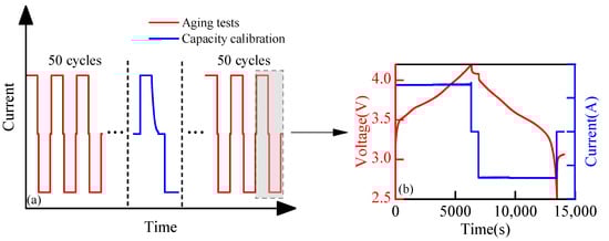 A battery test schedule was designed to investigate the influence of charging/discharging current and operating temperature on battery aging, which included two main steps, capacity calibration and an aging test, as shown in Figure 1a. The calibration procedure for both datasets adopted a 0.5 C constant current-constant voltage (CC-CV) charging and a 0.5 C discharging to obtain the residual capacity during the cycling aging, and a 1 h rest was set between charging and discharging. Capacity calibration was performed at 25 °C every 50 aging cycles.