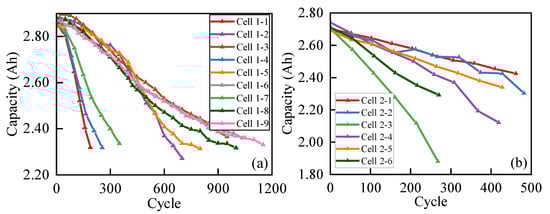Based on the above test matrixes, the capacity fading of the used cells is shown in Figure 2. It can be seen in Figure 2a that the capacity fading rate of cells 1-1, 1-4 and 1-7 was significantly higher than that of other cells. Moreover, cells 1-2, 1-5 and 1-8 also had a higher capacity fading rate than cells 1-3, 1-6 and 1-9. This indicates that a lower temperature will cause faster capacity decay, especially for 10 °C, which will dramatically increase the aging rate of the battery. In addition, at 10 °C and 25 °C, the aging rate of the battery decreased with the increase in the discharge rate. The possible reason is that with the same charging current rate, a battery with a smaller discharging current rate works in a relatively wide SOC interval. The lower limit of the SOC cycle interval decreases as the discharging current rate decreases. Cycling in the low SOC range will lead to faster attenuation of battery capacity and will likely lead to nonlinear accelerated attenuation of capacity [36]. This law is consistent with the law obtained in Refs. [37,38]. At 45 °C, the discharge rate has no significant effect on the aging rate of the battery. As can be seen in Figure 2b, the aging rate of cells 2-3 and 2-6 is higher than that of other cells. This indicates that a high charging rate (1 C) will significantly increase the battery aging rate. The main reason is that when the battery is charged at a low temperature or a high rate, the cathode will precipitate lithium metal attached to the graphite surface, and will react with the electrolyte, further consuming available circulating lithium-ions, resulting in rapid battery capacity decay [39].