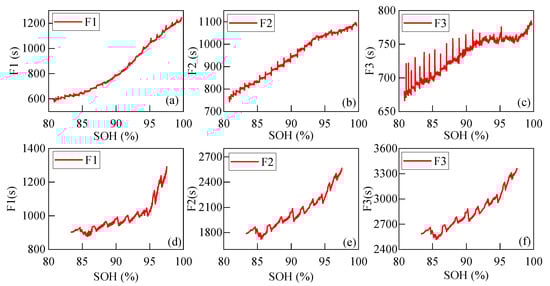 Figure 3 shows the variation of the charging voltage–time curves during battery aging. It can be seen that with the aging of the battery, the slope of the voltage–time curve increases. As a result, the time during equal voltage increase (TEVI) decreases. Therefore, TEVI in 3.6–3.7 V, 3.7–3.8 V, and 3.8–3.9 V were extracted as HIs, named F1-F3. The variation in TEVI of cells 1-9 and 2-2 during battery aging is shown in Figure 4 as an example, which experienced the longest aging test in each dataset.