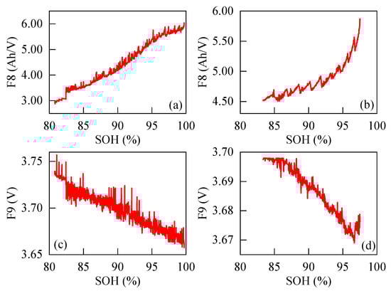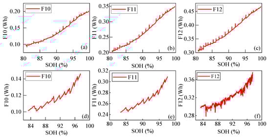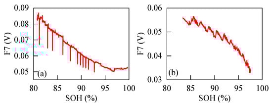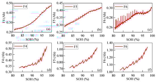 Figure 5 shows the variation of the charging electric quantity–voltage curves during battery aging. Similarly, the electric quantity during equal voltage increase (QEVI) shows a decreasing tendency with the aging of the battery. Therefore, QEVI in 3.6–3.7 V, 3.7–3.8 V, and 3.8–3.9 V are extracted as HIs, named F4-F6. The variation of QEVI of cells 1-9 and 2-2 during battery aging is shown in Figure 6 as an example.