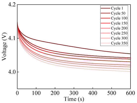 Figure 7 shows the variation in the charging voltage–time curves during the rest process after charging. It can be seen that as the battery ages, both the speed and the range of voltage drop increase. Therefore, voltage drop during rest (VDR) is extracted as an HI, namely F7. The variation of VDR of cells 1-9 and 2-2 is shown in Figure 8 as an example.