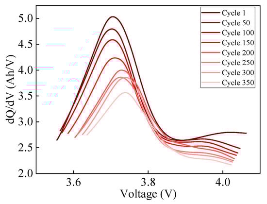 The peak in the IC curve has a unique shape, height, and position, which reflects the electrochemical reaction that occurs during the charging and discharging of lithium batteries [40], and the change in the peak may be related to the loss of active materials in lithium batteries [41]. The IC curve can transform the voltage plateau, at which the voltage curve rises slowly while reactions take place violently inside the battery, into the dQ/dV peak, which is easy to observe. Thus, it can reflect the distribution of charge (Q) in different voltage intervals through characteristic peaks [42] as well as small changes that are not easy to observe in the voltage-time curve. It contains more intuitive aging characteristics and is therefore widely used for SOH estimation of lithium-ion batteries [43].