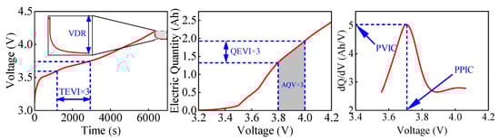 As stated above, 12 HIs are extracted from battery charging data, as shown in Figure 12. HIs include TEVI in three voltage intervals and VDR extracted from voltage–time curves, QEVI and AQV in three voltage intervals extracted from electric quantity–voltage curves, and PVIC and PPIC extracted from charging IC curves. The correlation between them and battery aging is analyzed based on the Pearson correlation coefficient (PCC), as shown in Equation (1).