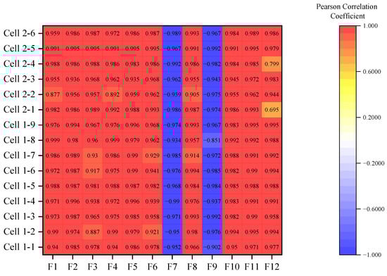 The PCCs between 12 HIs and the degradation of the cells are shown in Figure 13. It can be seen that F7 and F9 are negatively correlated with battery aging while the other HIs have a positive correlation with battery aging. Except for the F12 of cells 2-1 and 2-4, the absolute PCC values of other HIs are higher than 0.85. This indicates that most HIs are strongly correlated with battery aging. Furthermore, the PCC values of F10 and F11 on all cells are over 0.95, further indicating the strong correlation between HIs and battery aging.