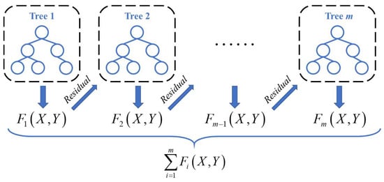 Using the point of maximum loss reduction calculated by the above formula as the best segmentation point, the tree of different structures is continuously generated by searching all possible splitting ways. Similarly, other nodes recursively repeat this process until the maximum depth of the tree is reached or stop growing when the sum of sample weights is less than a set threshold to prevent overfitting. The training process of a tree is thus complete. The training process for other trees is the same. The 2.1.1 version of the xgboost python package is used. A diagram of the XGBoost algorithm is shown in Figure 14.