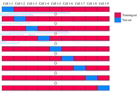 The training/test set-splitting strategy of this study is shown in Figure 16. For convenience, the figure only shows the strategy of Dataset I, but the training based on Dataset II utilizes the same strategy. In this study, for each time of model training, one cell in the training set is selected as the test set, and the other cells are used as the training set. Using the training set data as model input, BOA is used to optimize the hyper-parameters of the XGBoost model, and a set of optimal hyper-parameters is obtained. SOH estimation results are obtained on the test set using the optimal hyper-parameters.