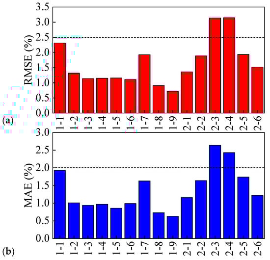 Based on the HIs extracted as stated above and the training–test splitting strategy, the SOH estimation results of cells 1-9 and 2-2 obtained by the aforementioned BOA-XGBoost algorithm are shown in Figure 17. It can be seen from Figure 17a that the SOH estimation results of cell 1-9 achieve high accuracy almost throughout the aging process, with a maximum error of less than 2%. In addition, the RMSE and MAE are 0.72% and 0.63%, respectively. As for cell 2-2, the SOH estimation results show some fluctuations during the aging process, but still achieve high overall accuracy, with RMSE of 1.89% and MAE of 1.64%. The estimation metrics of all cells are shown in Figure 18. As can be seen from the figure, except for cells 2-3 and 2-4, the RMSE and MAE of SOH estimation for most cells is less than 2.5% and 2%, respectively. This proves the estimation accuracy of the proposed BOA-XGBoost algorithm.
