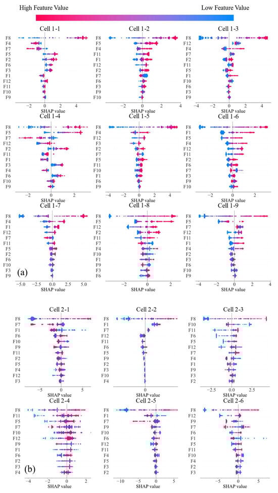 The SHAP can be used for explainability analysis of the model under all samples and analysis of the predicted value at a single sample point, called global interpreter and local interpreter, respectively. The SHAP summary plots are shown in Figure 20, which shows the overview of the SHAP value for each HI. Each point in the figure represents a sample point. The color of the points indicates the value of HI. As shown in the color bar at the top of Figure 20, sample points with higher HI values are indicated by red points, while those with lower HI values are blue. In addition, the X-axis indicates the SHAP value. Sample points with higher SHAP values are located on the right side of the figure, while those with lower SHAP values are on the left. Therefore, the wider the points of a HI are distributed along the X-axis, the greater its influence on the SOH estimation result. HIs are arranged from top to bottom in Figure 20 by the average absolute value of the SHAP value. It can be seen that F8(PVIC) has the largest average absolute value of SHAP, which means that it has the greatest impact on the results of SOH estimation. Moreover, the red points of F8 are always located on the right side of the figure, while the blue points on the left, indicating that F8 has a positive contribution to SOH estimation results. In addition, for cell 2-3, it can be seen from Figure 20b that many points are stacked on the same horizontal coordinate. Although the HI values of different sample points vary, the SHAP values of these sample points are the same, which means that the contribution to the SOH estimation results is the same. This indicates that, when estimating the SOH of cell 2-3, the model does not capture changes in the HIs of cell 2-3 as well as other cells, resulting in a relatively high error. With the global explainability analysis based on TreeSHAP, the differences in the contributions of different HI to the SOH estimation can be quantitatively analyzed.