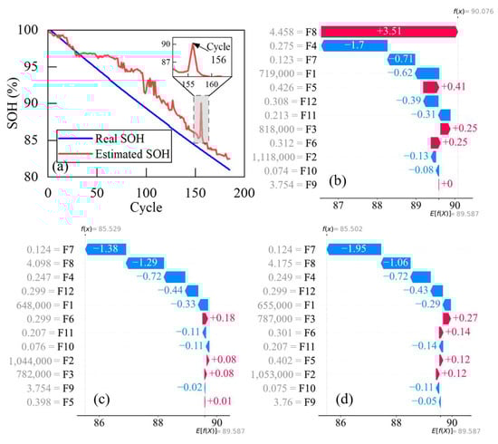 SHAP analysis for abnormal estimation value: (a) outlier in cell 1-1; (b–d): SHAP waterfall plot of cycles 156, 155, and 157.