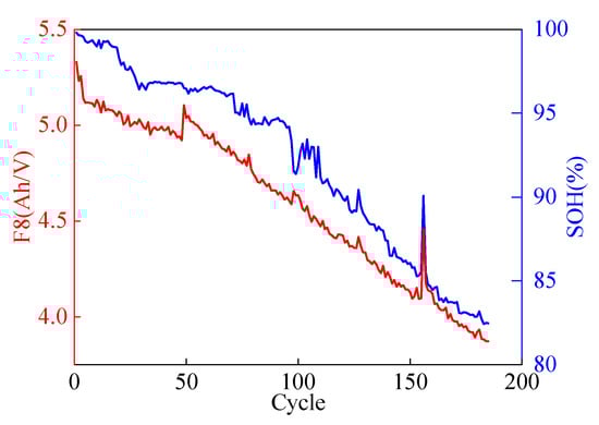 In the SOH estimation results obtained in the previous section, it can be found that there are some outliers. For outliers in SOH estimation, the local interpreter in SHAP can be used for explainability analysis. It can be found in Figure 21a that there is an obviously abnormal estimation value, cycle 156 in cell 1-1, with an estimated SOH of 90.076%. In contrast, the estimated SOHs of cycle 155 and 157 are 85.529% and 85.502%, respectively. In other words, there is an outlier at cycle 156 that is approximately 4.5% higher than the normal value. SHAP waterfall plots are used for local explainability analysis. They quantitively explain the SOH estimation result at a specific sample point. Numerically, the waterfall plot splits the deviation between the estimated SOH at a particular sample point and the mean SOH for all sample points and shows the contribution value for each HI. In other words, the deviation equals the sum of the SHAP values of all HIs. The SHAP waterfall plots of cycles 156, 155, and 157 are shown in Figure 21b–d, respectively. On the left side of the figure are the values of each HI. The arrows and the numbers in/next to them represent the SHAP value of each HI. It can be found that the F8 values of cycles 155 and 157 are 4.098 and 4.175, respectively. However, cycle 156 has an abnormally high F8 value of 4.458. And the SHAP value of F8 of cycle 156 (+3.51) is also abnormally higher than that of cycle 155 (−1.29) and 157 (−1.06). In addition, the SHAP values of other HIs fluctuate within the normal range. Therefore, it can be judged that the SOH estimation outlier of cycle 156 is caused by the abnormal fluctuation of F8. Figure 22 shows the F8 value and SOH estimation result of cell 1-1. It can be verified that there is an abnormal fluctuation of the F8 value at cycle 156. This supports the result of the local interpreter. By using the local interpreter in SHAP to analyze the explainability of the sample point where the outlier is located, the quantitative analysis results of the influence of HIs on the estimated SOH can be obtained. It can reveal the causes of the outlier and enhance the explainability of the model.