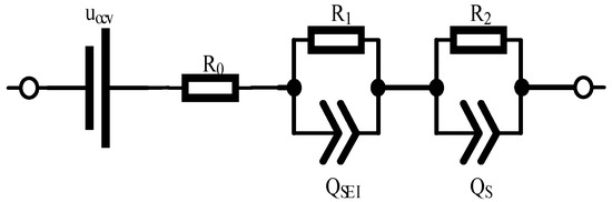 In recent years, fractional-order equivalent circuit models have been increasingly adopted [31,32,33]. The existing literature has demonstrated that fractional-order models can more accurately reproduce the time–frequency characteristics of batteries. Figure 1 depicts the second-order fractional equivalent circuit model used in this paper.