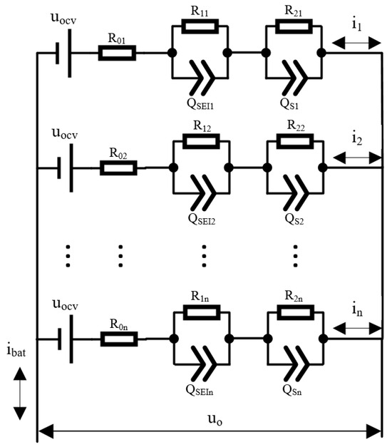 Based on the equivalent circuit model depicted in Figure 1, the proposed layered equivalent circuit model is shown in Figure 2. Lithium-ion batteries are composed of multiple composite layers that are wound together, and the relationship between these winding layers can be considered to be parallel connections within the equivalent circuit. During the theoretical derivation, a specific number of layers is not designated, and it is represented by the letter n.