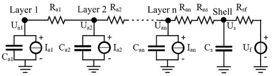 The steel shell of the battery has a thickness of approximately 0.2 mm, and while its radial temperature distribution can be disregarded, its heat capacity cannot be overlooked and is considered to be a lumped parameter. The equivalent circuit model for an n + 1 layer, constructed on this premise, is illustrated in Figure 3. The temperature of each layer is expressed by Uax (x = 1, 2, …, n), and the shell temperature is expressed by Us. The material’s equivalent thermal conductivity and the thermal resistance between layers are denoted by Rax (x = 1, 2, …, n). The contact thermal resistance between the outermost material and the shell is represented by Rns. The equivalent heat transfer resistance due to convection and radiation between the shell and the surrounding environment is denoted by Rsf. The heat capacity of each layer within the battery is defined as Cax (x = 1, 2, …, n), and the heat generation power is analogous to a current source with current values of Iax (x = 1, 2, …, n). The external environment of the battery is likened to a voltage source with Uf.
