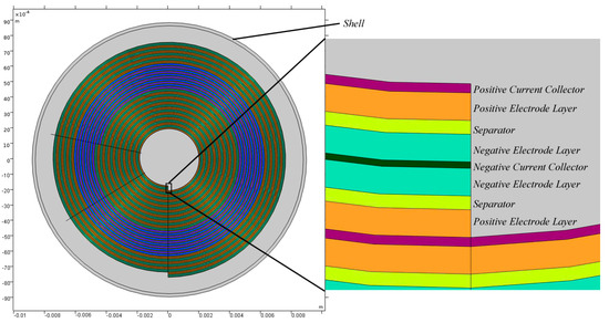 This model is a comprehensive 3D Newman model, inclusive of an additional dimension that describes the intercalation and diffusion of lithium particles at the granular scale. Moreover, the model takes into account the heat generation and thermal conduction processes caused by Ohmic polarization, electrochemical polarization, and more, involving components such as electrodes, separators, and current collectors. A composite sheet is rolled according to Figure 5. The thickness of the composite sheet is 3.34 × 10−4 m. It consists of individual layers of a positive current collector, a positive electrode, a diaphragm, a negative electrode, a negative current collector, a negative electrode, a diaphragm, and a positive electrode from bottom to top [37,38]. The whole winding structure is placed in a steel casing filled with electrolytes. Using the composite sheet of the battery as a unit and following the principle of equal volume, the interior of the battery is divided into three layers. In polar coordinates, the calculated angle of the inner layer is from 0 to 16.565π, the middle layer from 16.565π to 26.325π, and the outer layer from 26.325π to 34π. The highlighted middle section in Figure 5 represents the middle layer.