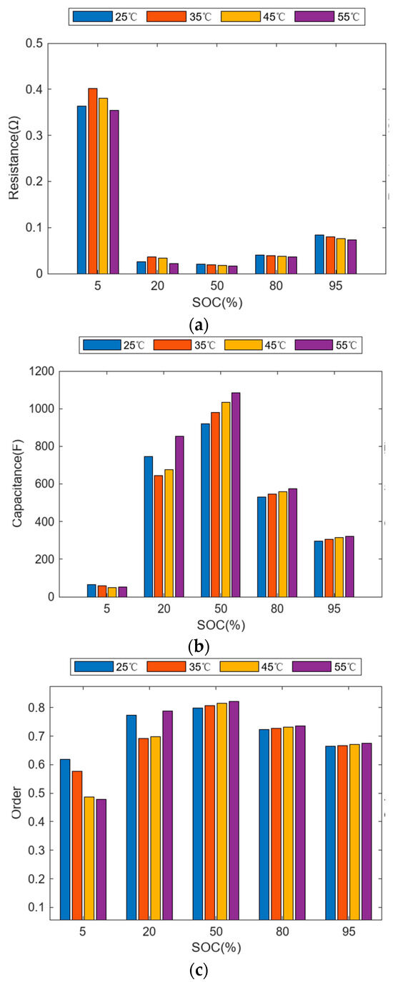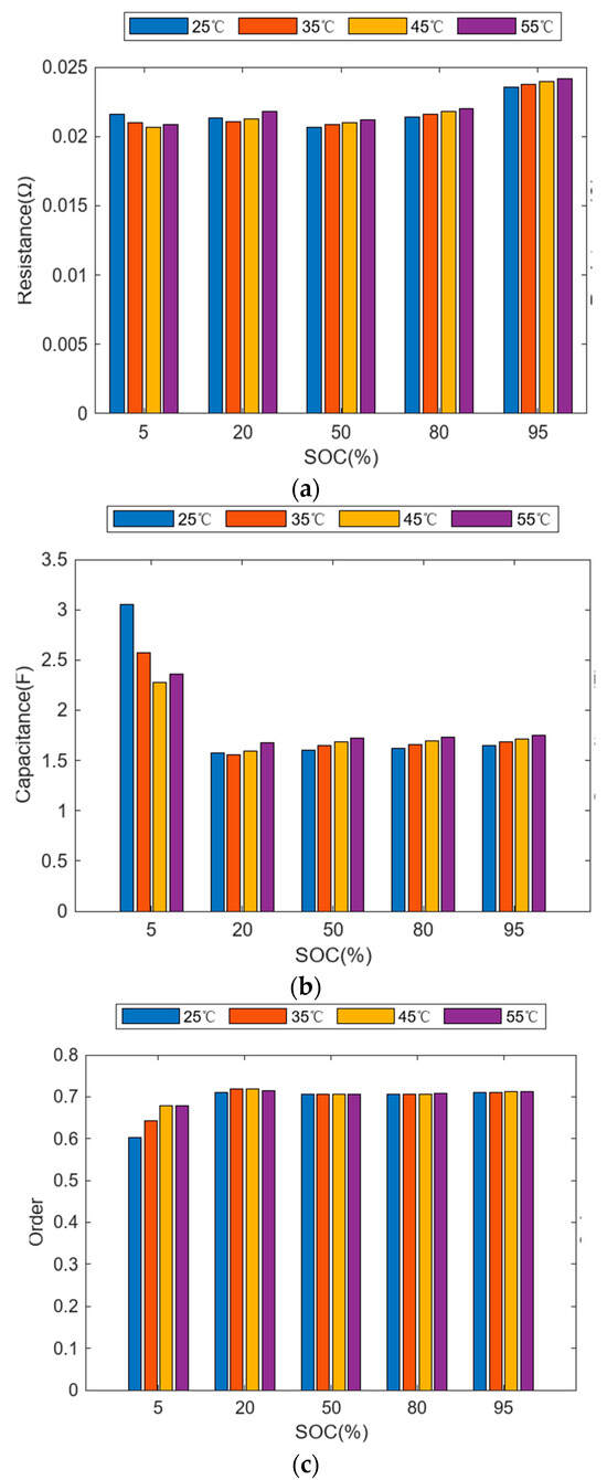 R0 characterizes the transfer impedance of lithium ions and electrons through the electrolyte, porous separators, conductors, active material particles, etc. As shown in Figure 6. The temperature range in the simulation, 25–55 degrees Celsius, represents the normal operating temperatures for lithium-ion batteries, and it can be observed from this figure that R0 tends to decrease gradually with increasing temperature. R0 does not vary significantly with SOC.