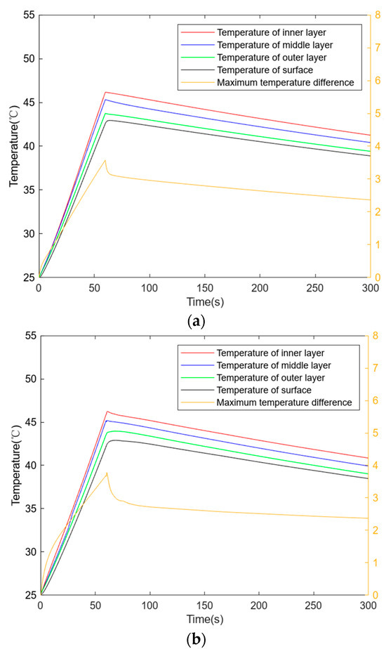 During the 10C discharge simulation, the starting SOC is set to 95%, with continuous discharge for 60 s and a total simulation duration of 300 s. The curves showing the changes in temperature and maximum temperature difference over time in the inner, middle, outer layers, and surface for both models are presented in the figure below.