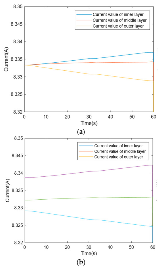 Curve of inner layer current, middle layer current and outer layer current: (a) LETECM, (b) 3DNFEM.