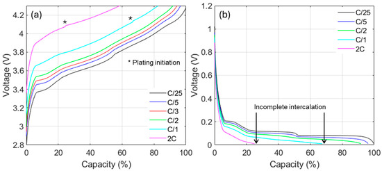 (a) Example of a graphite/lithium nickel–cobalt–aluminum oxide full-cell charging emulation at different rates showcasing the predicted lithium plating onsets (*). The simulations were performed using the alawa toolbox [28,35] using stock materials, a loading ratio of 1.2, and an offset of 2%. (b) Associated NE lithiation half-cell data used for the simulations.