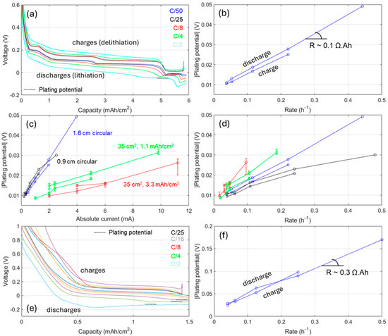 First, it was important to verify that the plating initiation potential is rate dependent. Figure 2a presents an experiment on a 1.6 cm2 graphite electrode vs. a metallic lithium counter electrode for which the cutoff at the end of discharge was set to 130% of the nominal capacity. Because the cutoff was set to be lower than typical for a graphite cell, some lithium plated. The observed response for the plating was in accordance with the literature [9,37,38], with a local minima reached before a stabilized potential that is slightly higher, followed by another drop that could be related to dead lithium, as reported by Wood et al. [39]. The plating and stripping potentials, measured as the maximum after the first local minimum is reached in discharge and the opposite in charge, were rate dependent, as shown in Figure 2b, symmetric, and had their absolute value increase linearly with the rate and a resistance of about 10 mΩ or 0.1 Ω Ah when normalized to the rate. This resistance will be referred to as the plating resistance in the rest of this work.
