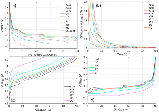 Based on the results obtained, a new RPT protocol was tested with a rate-dependent end-of-discharge cutoff voltage. For this preliminary work, the goal was not to go as low as possible but to demonstrate the concept. The cutoff voltages were chosen to progressively decrease from −5 mV to −115 mV when the rate increased from C/25 to 4C, as shown in Figure 3a. The new protocol was successful in allowing more complete discharges for higher rates with an increase in capacity of 20%, 33%, and 20% for 4C, 2C, and 1C, respectively. It must be noted that the 2C and 4C discharge might still be incomplete since no inflection point was reached at the end of discharge. Moreover, no electrochemical features associated with lithium plating were observed. However, since plating could still have happened locally, the rest cell voltages after discharge were investigated thoroughly, as the literature showed that the lithium stripping that would occur during rest has a distinguishable signature [9,37,40,41,42] with a plateau after around, at least, 15 min of rest. Figure 3b presents the differential voltage analysis, dV/dt, as a function of t for the rests measured after discharge. The evolution of the rests was found to be monotonic, and no plateau associated with plating was observed, even for the higher rates where the discharge was stopped more than 100 mV below the traditional cutoff. This confirms that the plating potential is indeed rate dependent and that discharges below 0 V for NE could be performed to extract more information. However, the full impact on rate capability and durability is yet to be assessed.