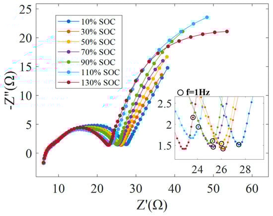 To seek a constant frequency as the characteristic frequency applied in the following diagnosis of the lithium plating onset, the EIS of the self-made half-cells was measured at a constant temperature of 25 °C and at different SOCs, and the results are shown in Figure 4. As SOC changes, it can be observed that the impedance change within the moderate and low-frequency bands is most obvious, corresponding to the frequency range of approximately 1–100 Hz. Considering that the charge transfer process is highly related to SOC, it is reasonable to assume that the impedance change between 1 and 100 Hz mainly depends on the change in the charge transfer process [32,37,45]. The occurrence of lithium plating affects the charge transfer process inside the battery, so the frequency of the injected square-wave current during discharging is finally set to 1 Hz, i.e., the frequency of the fundamental wave obtained after fast Fourier transform of the discharge current and terminal voltage is 1 Hz. Furthermore, the impedance change at 1 Hz can also be calculated.