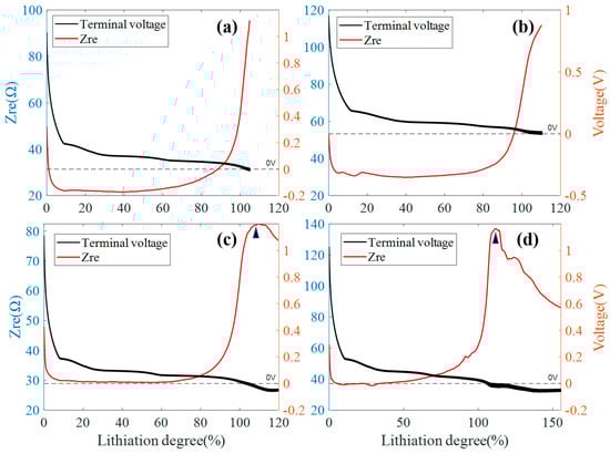 Figure 5 shows the variation in the terminal voltage and the real part of the 1 Hz impedance of four half-cells. In Figure 5a,b, for G1#1 and G1#2 with minor discharge depths, we can see that the terminal voltage of these two cells remains above 0 V and the real part of their impedance at 1 Hz frequency keeps increasing in the late stage, except for a decreasing trend in the early stage. In Figure 5c,d, for cells G1#3 and G1#4 with discharge depths of 120% and 156%, the terminal voltage decreases to below 0 V in the late stage of discharge, and the real part of the 1 Hz impedance has a turning point at a later stage, marked by “▲” in Figure 5c,d, after which the magnitude gradually decreases. The exact lithiation degrees, corresponding to the zero point of terminal voltage and the inflection point of the impedance, are listed in Table 2. The zero point and the inflection point correspond to nearly the same graphite lithiation degree, i.e., also the same time point.