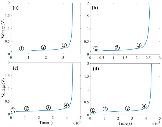 Variation in terminal voltage during the charging processes of four half-cells. (a) G1#1, (b) G1#2, (c) G1#3, (d) G1#4.