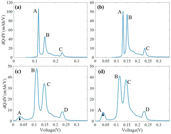 As auxiliary verification, the terminal voltage variation and IC curves during the subsequent charging process of the four half-cells were researched, as shown in Figure 6 and Figure 7, where the charging voltage plateaus ①②③④ in Figure 6a–d correspond to the peaks A, B, C, and D in Figure 7a–d, respectively. Combined with Figure 5, for cells G1#1 and G1#2 with 105% DOD and 110% DOD, their terminal voltages were always above 0 V during the discharging, and the real part of the impedance remained increasing during the late stage. There is also no abnormal lithium plating peak in the IC curves in Figure 7a,b, indicating that no lithium plating occurred during discharging. Otherwise, for G1#3 and G1#4 cells with DODs of 120% and 156%, the terminal voltage gradually drops below 0 V, and the real part of the impedance shows a turning point in Figure 5. Correspondingly, there is also an abnormal lithium plating peak (peak A) in the IC curves, which is marked with “▲” in Figure 7c,d, indicating that lithium plating occurred during the discharging process.