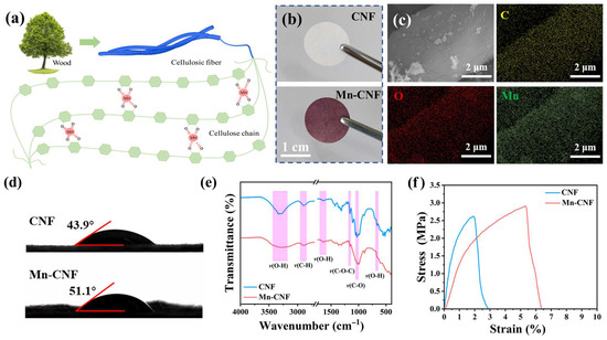 (a) Schematic of the fabrication process of Mn-CNF separator, (b) digital photos of CNF and Mn-CNF, (c) SEM images with EDS mapping of Mn-CNF, (d) contact angles, (e) FTIR spectra, and (f) stress–strain curves of CNF vs. Mn-CNF.