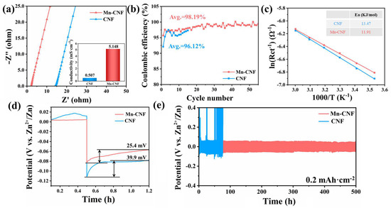 (a) Ionic conductivity of Mn-CNF and CNF; (b) Zn plating/stripping CEs with different separators at 1 mA·cm−2 and 1 mAh·cm−2; (c) Arrhenius curves and corresponding Ea values of Zn||Zn cells with Mn-CNF and CNF; (d) voltage–time curves of Zn plating processes with CNF and Mn-CNF separators at 0.2 mAh·cm−2; (e) galvanostatic cycling stability of symmetric Zn||Zn cells with Mn-CNFs and CNFs at 0.2 mAh·cm−2.
