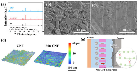 To gain further mechanistic insights, an XRD analysis was conducted on Zn anodes subjected to 20 galvanostatic cycles from the different batteries. Figure 3a shows the presence of Zn4SO4(OH)6·4H2O byproducts on the surface of the Zn electrode in the symmetric Zn||Zn cells that use CNFs with a corresponding large sheet-like byproducts observed via SEM [31]. The formation and detachment of the Zn dendrites are evident when using CNFs, which severely compromise cell performance (Figure 3b). In contrast, no discernible byproducts were detected on the Zn anode with Mn-CNFs as the separator, thus indicating a significant reduction in side effects. Additionally, the surface of the Zn anode is smooth without substantial Zn particles, which is attributed to the orderly regulation of the Zn-ion deposition facilitated by the Mn-CNFs (Figure 3c). The ultra-depth microscope images presented in Figure 3d further show that the Zn electrode with Mn-CNFs as the separator exhibits markedly less surface roughness compared to that with CNFs which confirms that Mn-CNFs can homogenize Zn deposited morphology by effectively regulating the Zn deposition behavior. Based on the aforementioned research, it is evident that the incorporation of Mn ions into the cellulose matrix effectively forms Mn-coordinated structures, thereby enhancing both the stability and ion conductivity (Figure 3e). This enhancement subsequently boosts the transport rate of the Zn ions [32,33]. Furthermore, the presence of Mn ions leads to a reduction in the nucleation overpotential for Zn, facilitating the uniform deposition of Zn ions and significantly reducing the risk of dendrite formation. Additionally, the abundant hydroxyl groups enhance both the solubility and diffusivity of Zn ions, thereby optimizing the cycling stability and rate in battery applications. It is also worth noting that the modified cellulose-based separator can achieve comparable electrochemical performance with other previously reported separators, especially in terms of cycle stability and ion conduction rates [34,35,36].