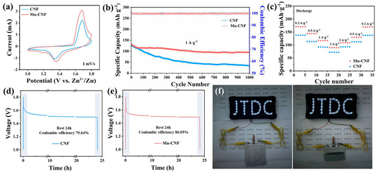(a) CV curves of Zn||MnO2 batteries with Mn-CNFs and CNFs at 1 mV·s−1, (b) cycling performance at 1 A·g−1, and (c) rate capability at different current densities. Self-discharge curves of Zn||MnO2 batteries with (d) CNFs or (e) Mn-CNFs, and (f) flat and folded pouch cells light up LED display screen.