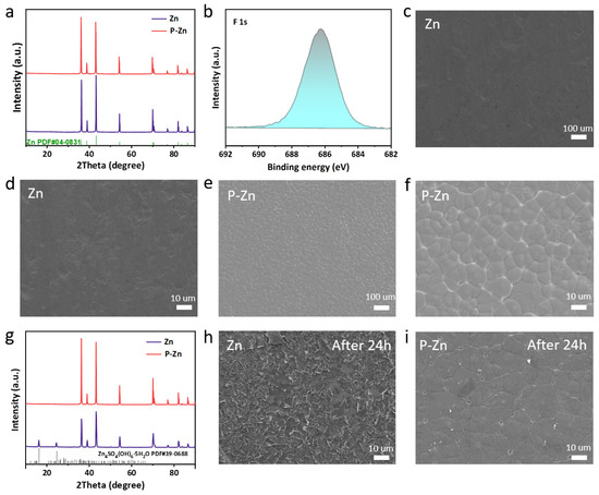 Characterization results: (a) XRD patterns comparing Zn and P-Zn. (b) High-resolution XPS spectrum for the F 1s region of P-Zn. (c,d) FESEM images showing the surface morphology of bare Zn and (e,f) FESEM images of P-Zn. (g) XRD patterns of both bare Zn and P-Zn after 24 h of immersion. (h,i) FESEM images depicting surface changes in bare Zn and P-Zn post 24 h of immersion.