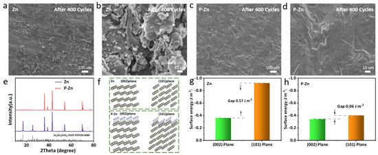 FESEM images of Zn (a,b) and P-Zn (c,d) electrodes; (e) XRD patterns of Zn and P-Zn electrodes. (f) The crystal models of DFT calculation. Surface energies of Zn atoms adsorbed on bare Zn (g), P-Zn (h) (002), and (101) planes.