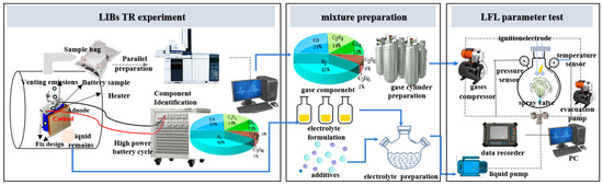 To investigate the ignition sensitivity parameter and severity parameter for thermal failure battery emission, the below framework (Figure 1) is adopted in this article. The key to distinguishing failed LIBs’ emission flammability is the identification of its components. Thus, firstly, the LIBs’ thermal runaway experiment is conducted. With a gas-collection bag, the gas components and proportion can be determined by GC. According to the remaining liquid, the battery electrolyte formulation can be deduced. With a clear sense of the emission component, the gas cylinders and electrolyte can be prepared to implement the flammability parameters for the gases/electrolyte and their mixture. According to the flammability test, a 20 L sphere apparatus is adopted. Furthermore, the flammability inhibition effect for the gas–liquid mixture with additives shall be discussed.