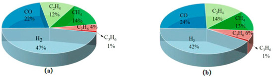 As shown in Figure 3a, the proportions of CH4, C2H6, C2H4, C3H6, CO, and H2 are 14%, 4%, 12%, 1%, 22%, and 47%, respectively. As shown in Figure 3b, the proportions of CH4, C2H6, C2H4, C3H6, CO, and H2 are 13%, 6%, 14%, 1%, 24%, and 42%, respectively. Among them, H2 has the highest proportion, followed by CO, with a relative error of <5%. The relative concentration error for CO is 4.5%, and for H2, it is 11.9%. This indicates that the test results have good repeatability. Additionally, the flammability tests follow the gas component results in Figure 3a to prepare the gases.