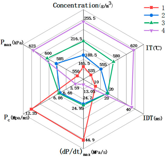 The index parameters of Pmax, (dP/dt)max, and Pc represent the mixture’s combustion releases energy. As for the electrolyte of No.4, when mixed with gases, the new type two phases’ severity parameters can be seen in Figure 8.