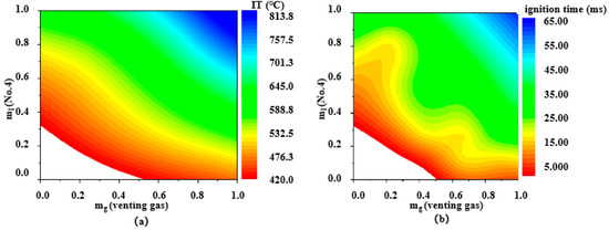 The IT and ignition time for the gas–electrolyte (1 mol LiPF6 in EC:DEC = 1:1 vol%) mixtures can be seen in Figure 4. These two index parameters denote the difficulty degree/likelihood of mixture ignition. Higher values of IT and ignition time suggest a lower likelihood of ignition, with lighter colors indicating a safer condition and red color indicating a hazard. It can be found that the non-flammable region has a 10 J sparkle electrode, where mg < 0.15 and ml < 0.1.