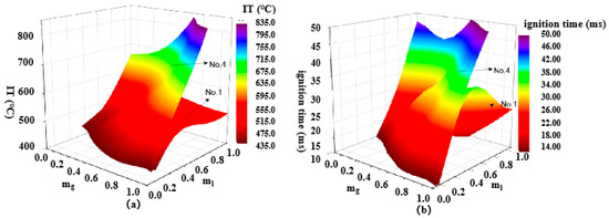 As shown in Figure 7a, when mg is kept stable, the IT gets elevated with ml increases. For example, when mg = 0.5, the mixture concentration ratio pair (mg, ml) is (0.5, 0.2), and the IT is 458 °C. As the ml increases to 0.8 from 0.2, the mixture concentration ratio pair (mg, ml) is (0.5, 0.8), and the IT is 615 °C, which can be increased by 34.2%.