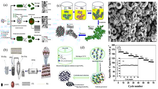 Schematic illustration of the preparation process for the (a) LiFePO4/C via the high−temperature solid−phase method []. (b) LiFePO4 crystals via the hydrothermal method []. (c) LiFePO4/Graphene composite via the microwave synthesis method []. (d) Mg doped LiFePO4@C composite via the carbon reduction method []. (e) Morphology and properties of bowl-shaped lithium iron phosphate and (f) cycling performance of battery with lithium iron phosphate electrode [].