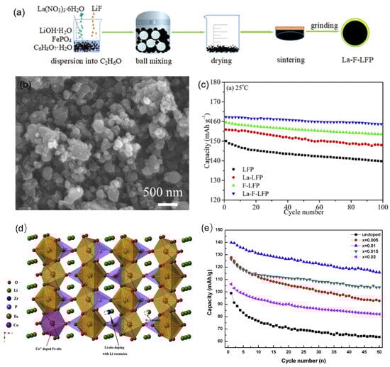 (a) Schematic illustration of the preparation process for the La-F-doped lithium iron phosphate, (b) morphology of doped lithium iron phosphate, (c) cycling performance of doped lithium iron phosphate [], (d) crystal structure of Zr co-doped via the LiFePO4 system, and (e) cycling performances of LiFePO4 and Li0.99Zr0.0025Fe1−xCoxPO4 (x = 0.005, 0.01, 0.015, 0.02) at 0.1 C [].