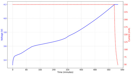 Once charging is complete, the battery is given a break for 5 min to stabilize before proceeding to the discharge phase. During the discharge phase, the battery is drained at a current determined by its unique discharge characteristics till the voltage drops to 3 V, completing the whole charge–discharge cycle.
